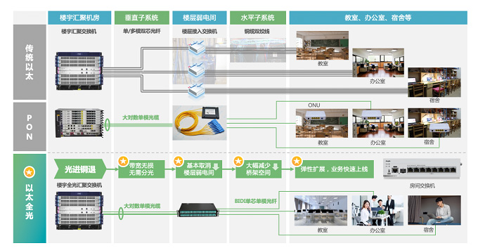 第一,極簡光方案建設(shè)校園基礎(chǔ)承載網(wǎng),架構(gòu)扁平簡單高效,在教學(xué)、辦公和宿舍場景多角度滿足高校的需求。極簡以太全光網(wǎng)解決方案較其他全光網(wǎng)方案來說無需分光帶寬沒有衰減,超大帶寬滿足教學(xué)場景新增應(yīng)用和宿舍場景學(xué)生的學(xué)習(xí)娛樂的需求。同時基本取消樓層弱電間,大幅減少橋架空間,從樓棟到室內(nèi)三層變兩層,極簡扁平的架構(gòu)滿足有線無線全光接入。交換機(jī)入室部署讓學(xué)校業(yè)務(wù)的彈性擴(kuò)展更強(qiáng),新業(yè)務(wù)的上線更快,室內(nèi)交換機(jī)即插即用,實(shí)現(xiàn)零配置上線,故障設(shè)備輕松替換,降低建設(shè)成本和維護(hù)成本,全光AP還通過低壓直流集中供電方案解決用電安全性問題。