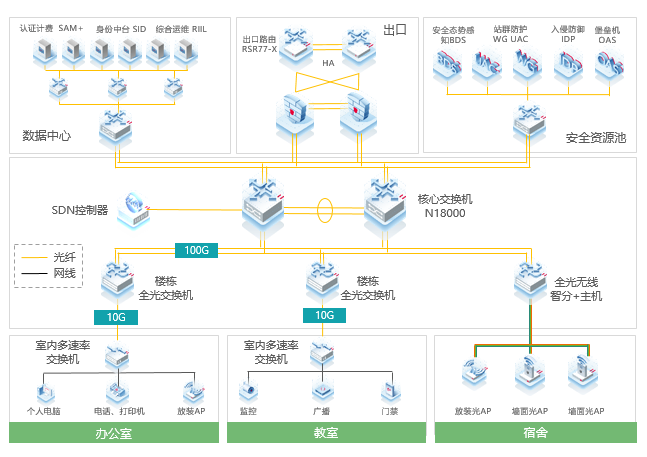 作為教育信息化建設(shè)的基礎(chǔ)支撐,校園網(wǎng)絡(luò)的建設(shè)工作向來是教育部、工信部關(guān)注重點(diǎn)。兩部委聯(lián)合發(fā)布《關(guān)于提高高等學(xué)校網(wǎng)絡(luò)管理和服務(wù)質(zhì)量的通知》指導(dǎo)高校進(jìn)行光纖網(wǎng)絡(luò)的建設(shè),全光網(wǎng)成為了校園網(wǎng)建設(shè)的新方向。銳捷推出的高校極簡以太全光網(wǎng)解決方案(下文簡稱“極簡光方案”),通過高速全光網(wǎng)的基礎(chǔ)設(shè)施建設(shè)來釋放智慧校園創(chuàng)新活力。極簡光方案采用全光纖鏈路和以太協(xié)議相結(jié)合的組網(wǎng)架構(gòu),有效解決高校校園網(wǎng)建設(shè)中傳統(tǒng)以太網(wǎng)業(yè)務(wù)擴(kuò)展性弱,新業(yè)務(wù)上線復(fù)雜、建設(shè)周期長,以及弱電設(shè)備多造成的維護(hù)復(fù)雜等問題。將政策指導(dǎo)落到實(shí)處,實(shí)現(xiàn)校園網(wǎng)切合實(shí)際、面向未來的架構(gòu)建設(shè)。